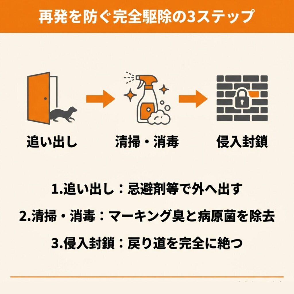 追い出し→清掃・消毒・消臭→侵入経路封鎖という流れを徹底することが完全駆除への近道です。