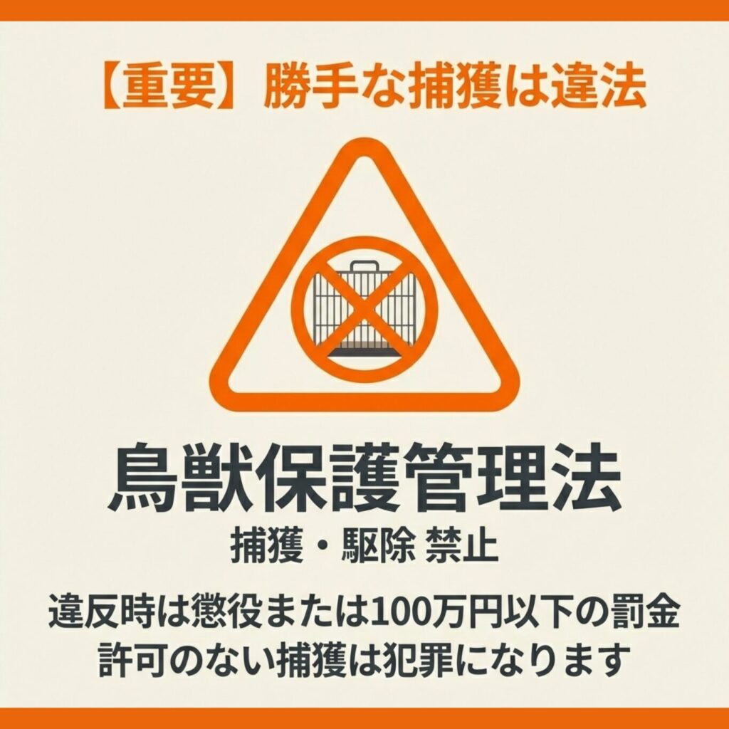 法律面でも、鳥獣保護管理法により無許可での捕獲・駆除は禁止されており、専門業者に依頼することが最善の選択でしょう。