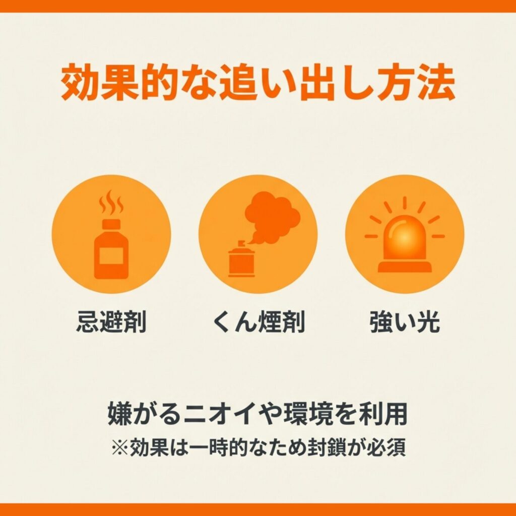忌避剤の効果は一時的であり、侵入経路の封鎖と併用することが重要でしょう。