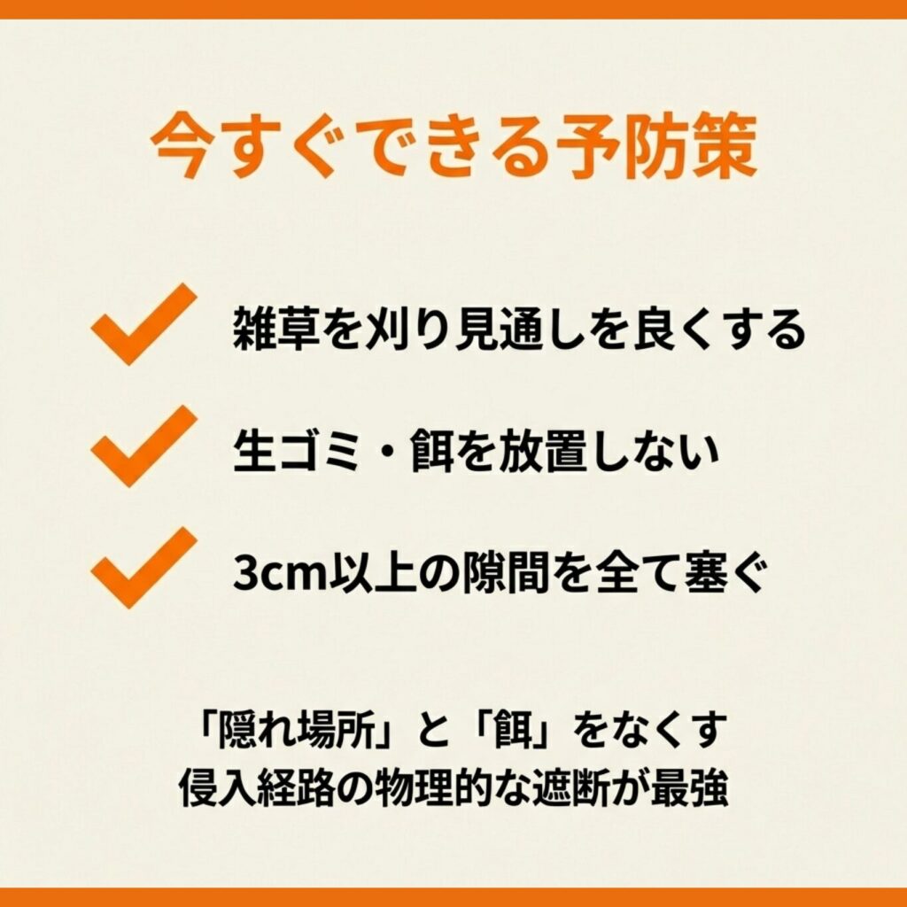 特に秋から冬にかけては、暖かい場所を求めて家屋への侵入を試みる個体が増えるため、一年を通じて警戒を怠らないことが大切です。