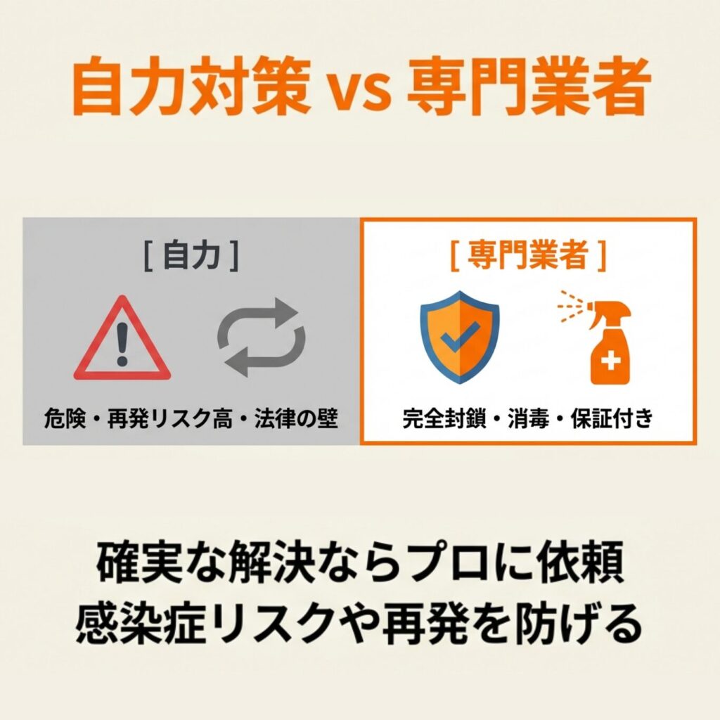 自力での対策も可能ですが、すべての侵入経路を特定・封鎖するのは非常に困難であり、法律違反や健康被害のリスクもあります。