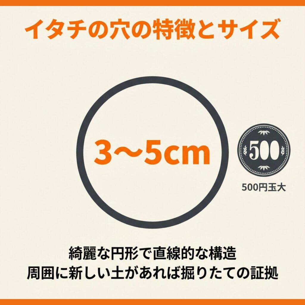 イタチが掘る穴の入口は、直径3〜5cm程度の円形であることが多く、500円玉よりやや大きいサイズです。