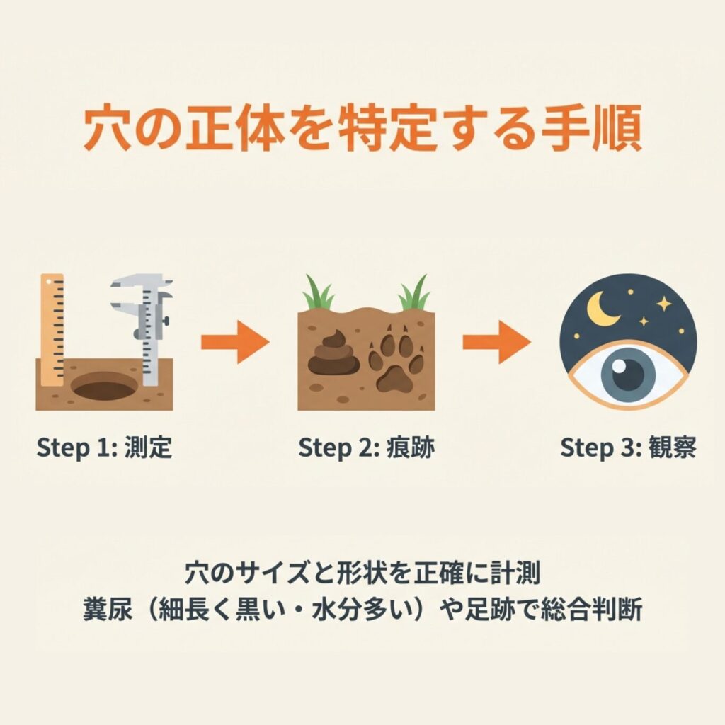 穴を掘った動物を正確に特定するには、複数の手がかりを総合的に判断することが重要です。