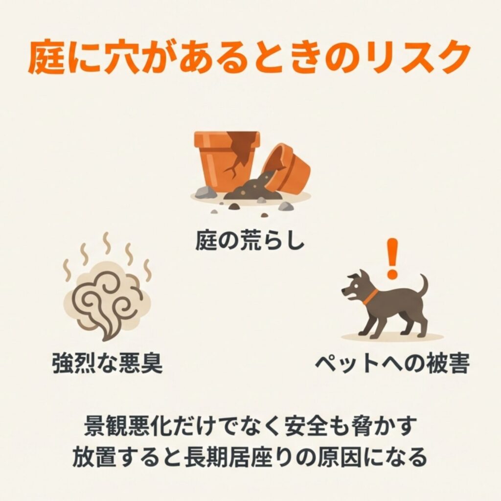 こうした穴が庭じゅうに広がると、地面がボコボコになり、景観だけでなく人がつまずく危険性も生じます。