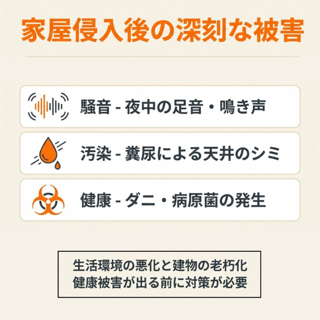 激しい騒音や糞尿の悪臭は生活の質を大きく損ないます。捕獲許可取得から対応可能な専門家にご相談を。