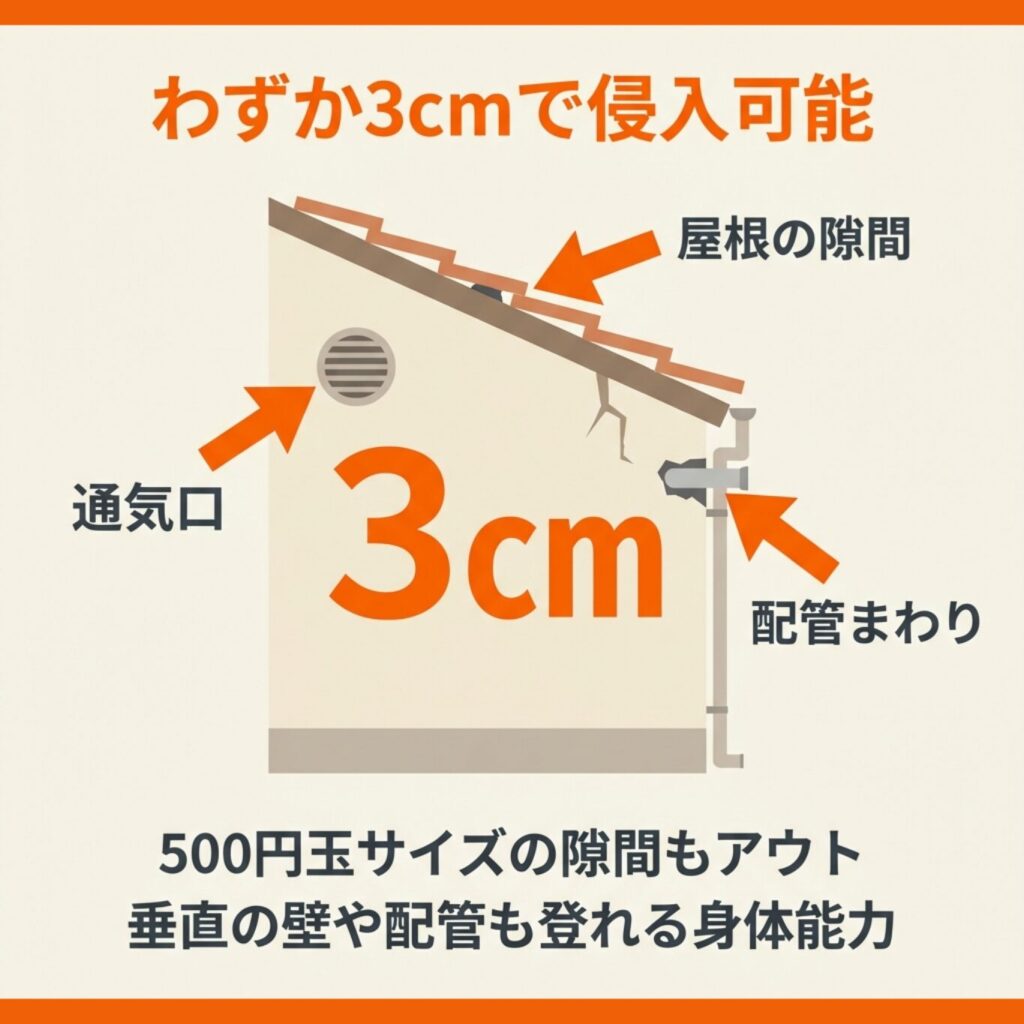 わずか3cmの隙間でも残っていれば、イタチは必ずそこから再侵入してきます。