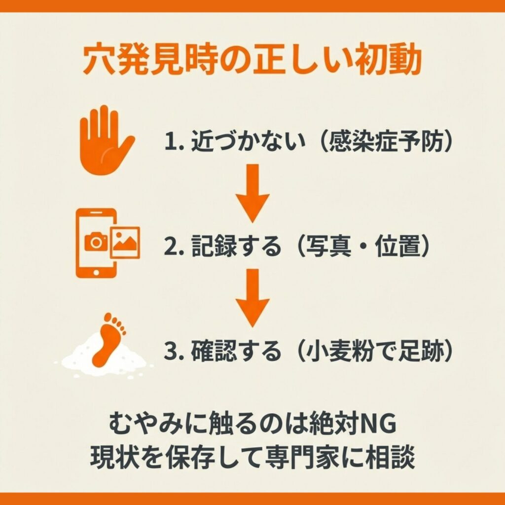 毒ヘビの可能性も考慮し、穴に近づく際は十分な注意が必要です。