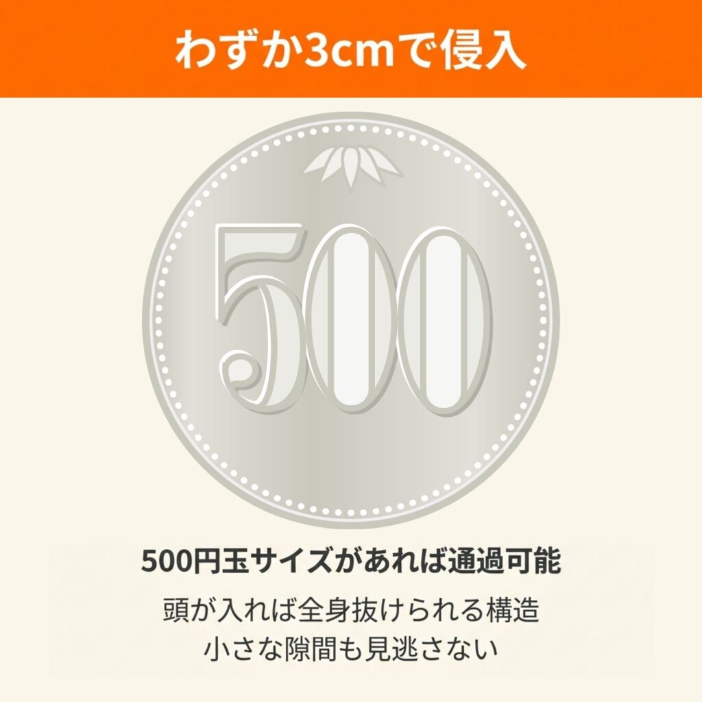 一般的に直径3cm(500円玉よりやや大きい程度)の穴があれば侵入可能とされており、人間が見落としがちな小さな隙間も侵入経路になり得ます。