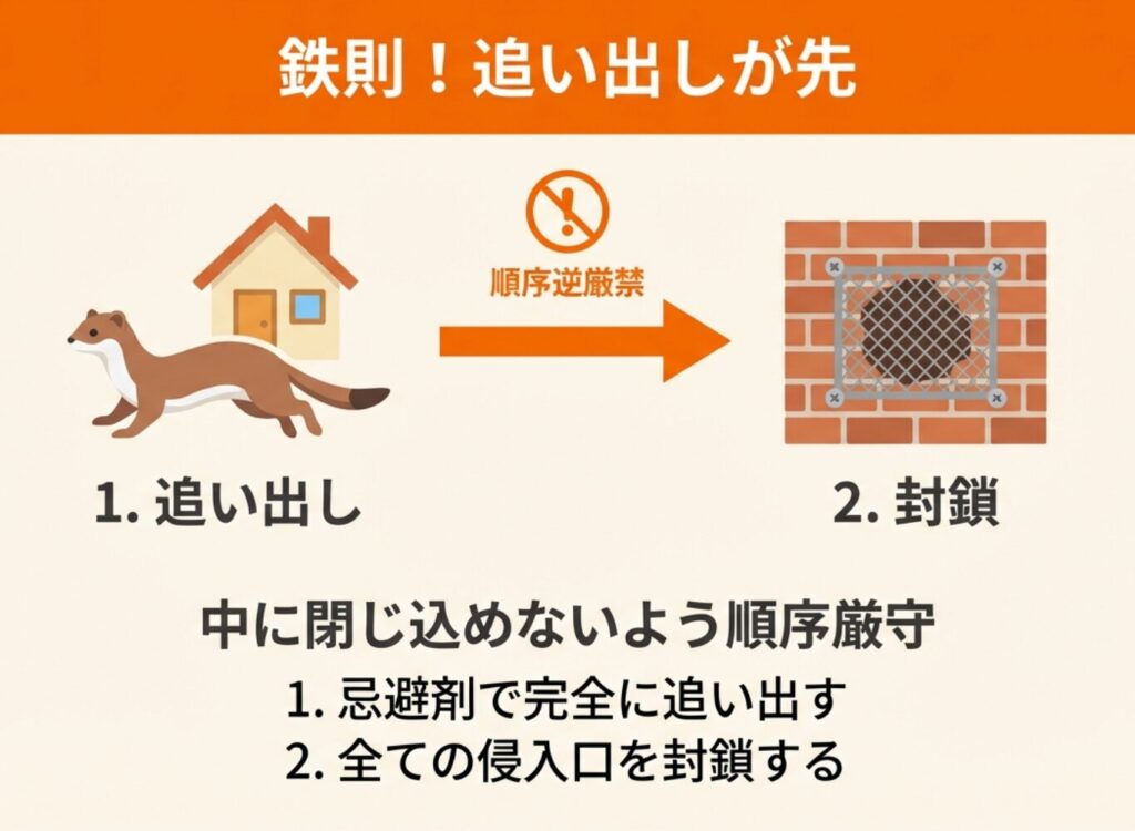 追い出しだけを行っても侵入口が開いたままでは再侵入を許してしまい、逆に侵入口を塞いでもイタチが中にいる状態では閉じ込めてしまうことになります。