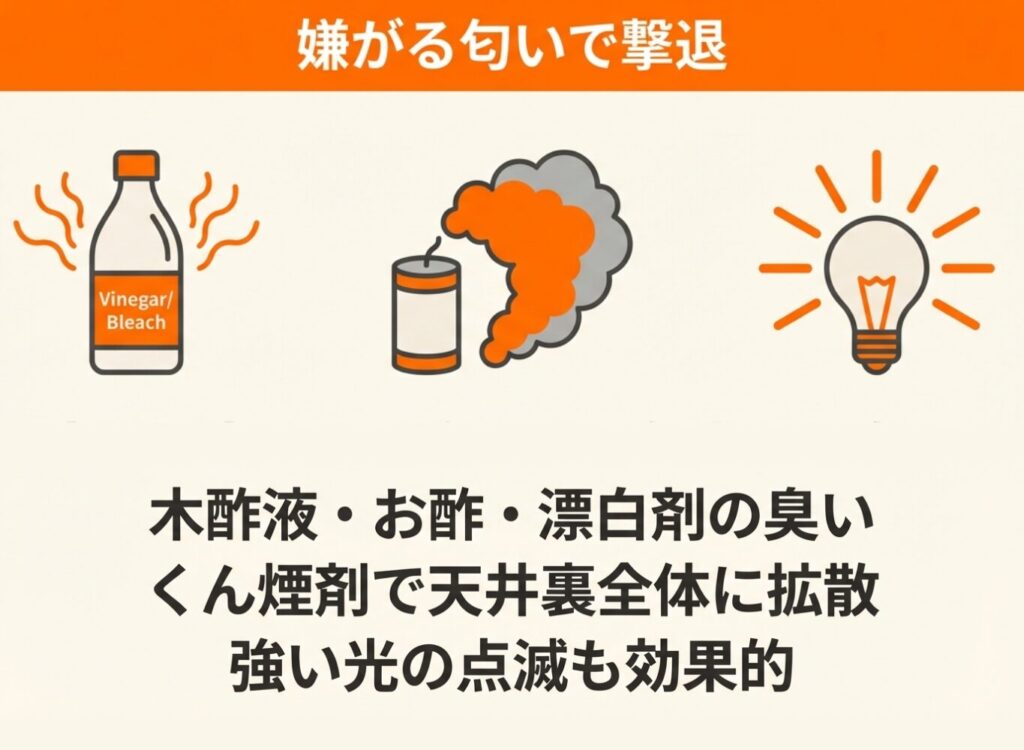 くん煙剤も忌避剤と同様に効果が一時的な場合があるため、追い出し後の侵入口封鎖と組み合わせることが重要です。
