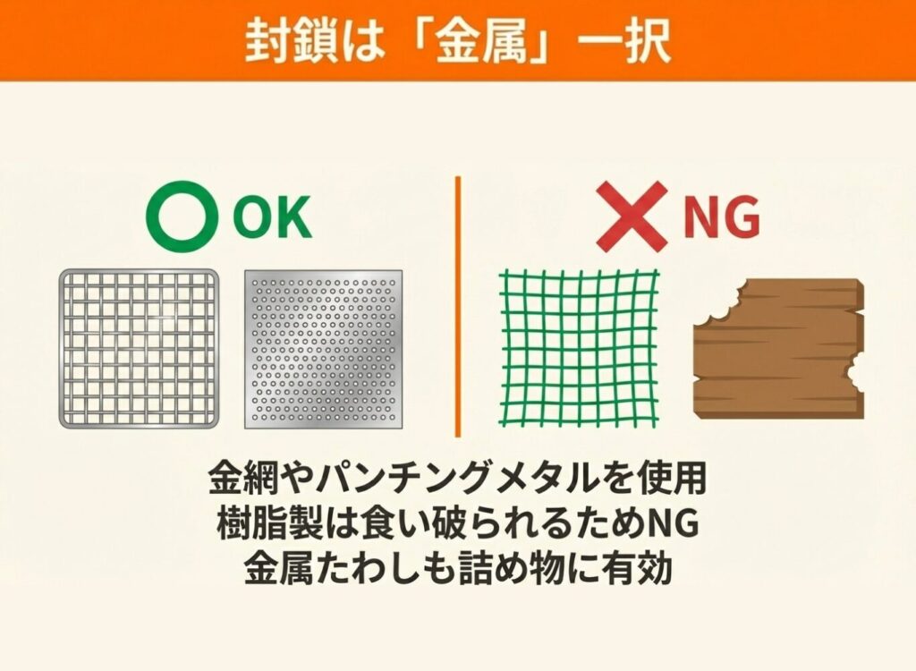 封鎖に使用する素材としては、金属製の網やパンチングメタル、金属たわしなどが推奨されています。