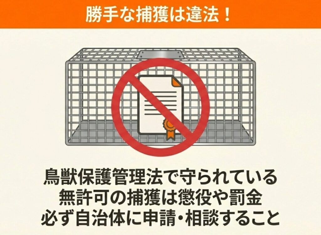 捕獲を行う場合は、お住まいの自治体へ事前に申請し、許可を得る必要があります。
