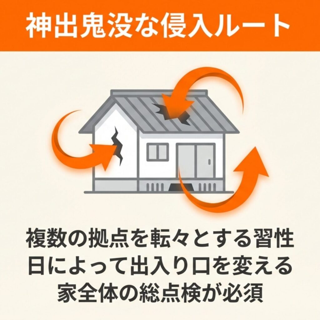 ある日は床下の通気口から、別の日は屋根の隙間からといった具合に、状況に応じてルートを変えることがあります。