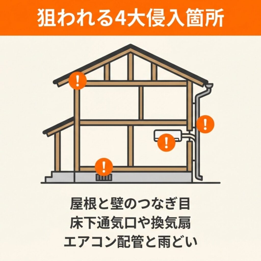 屋根裏にたどり着くまでの経路はさまざまですが、家屋の構造上どうしても生じてしまう隙間が狙われやすい傾向にあります。