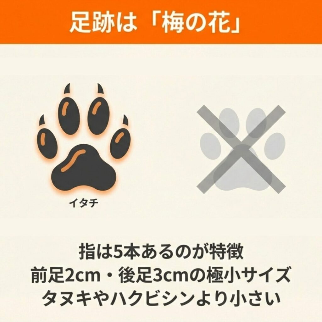 イタチの足跡はタヌキやハクビシンと比べて小さめであり、指の数や配置で見分けることができます。