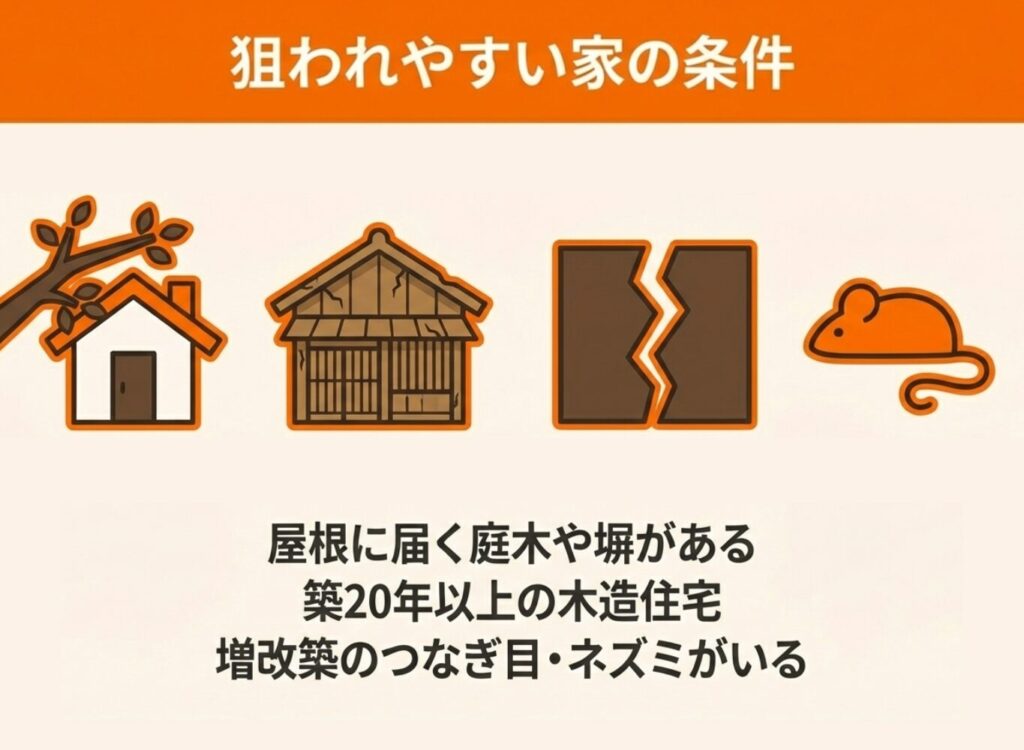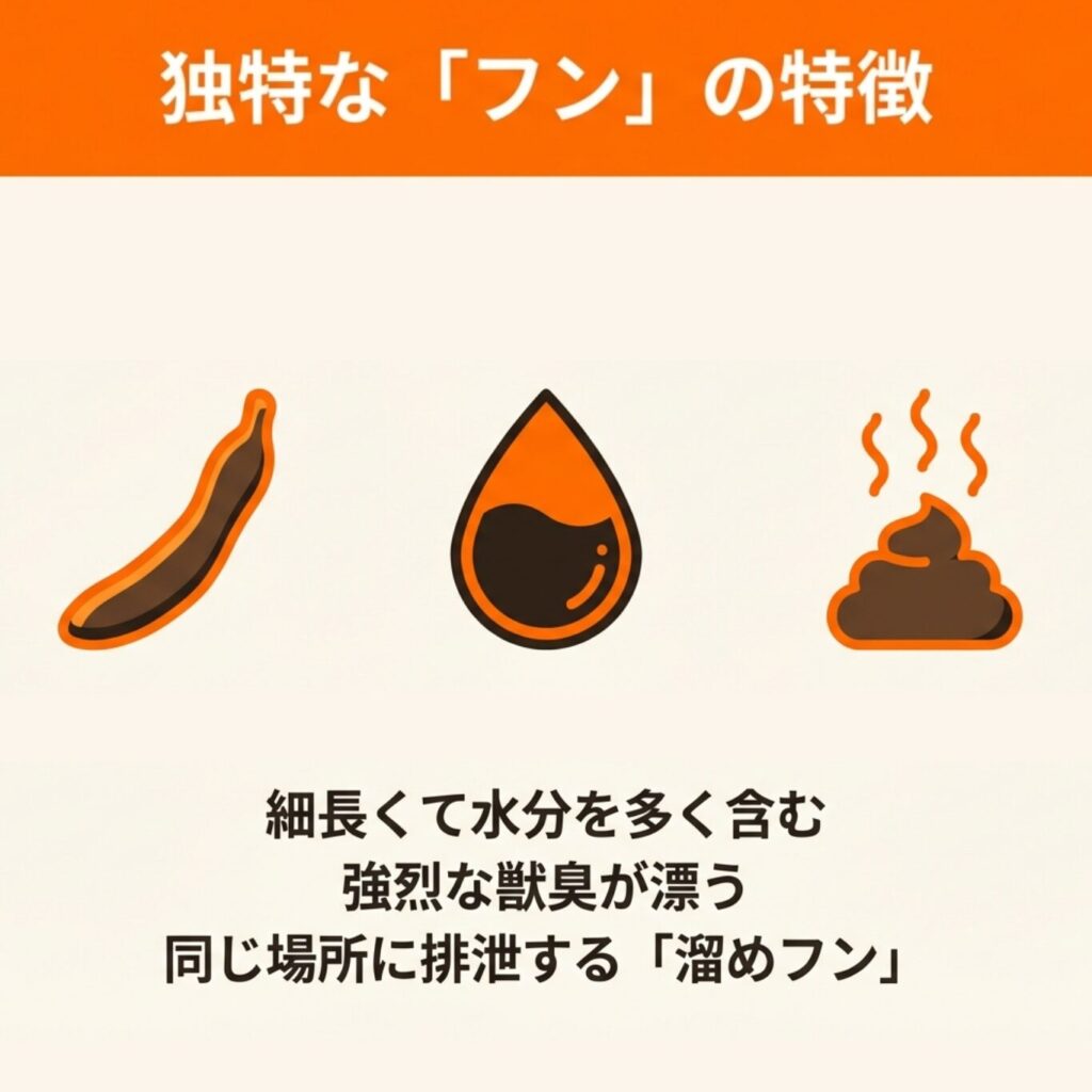 強い獣臭を伴うこともあり、臭いを手がかりにフンの場所を特定できるケースもあります。