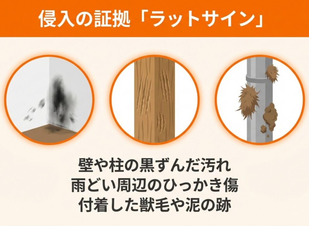 足跡やフン、汚れなどの痕跡を手がかりに侵入口を特定し、追い出しと封鎖をセットで行うことが再発防止の基本です。