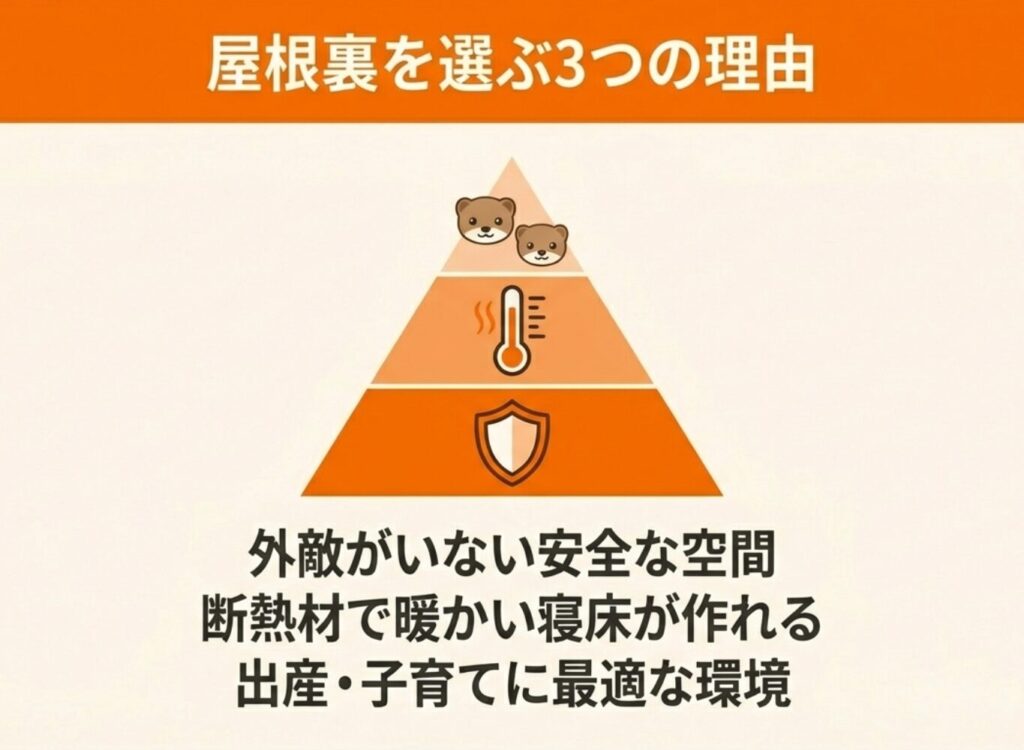 イタチは暗くて静かな屋根裏を好み、巣を作る場所として選ぶことが多い害獣です。