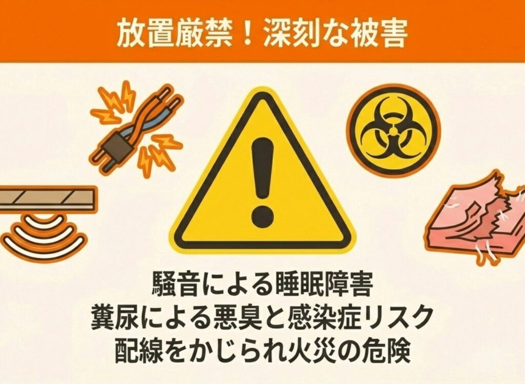 放置すると騒音被害、糞尿による悪臭やシミ、断熱材の損傷、ダニやノミの発生、電気配線をかじられることによる火災リスクなど、深刻な被害につながります。