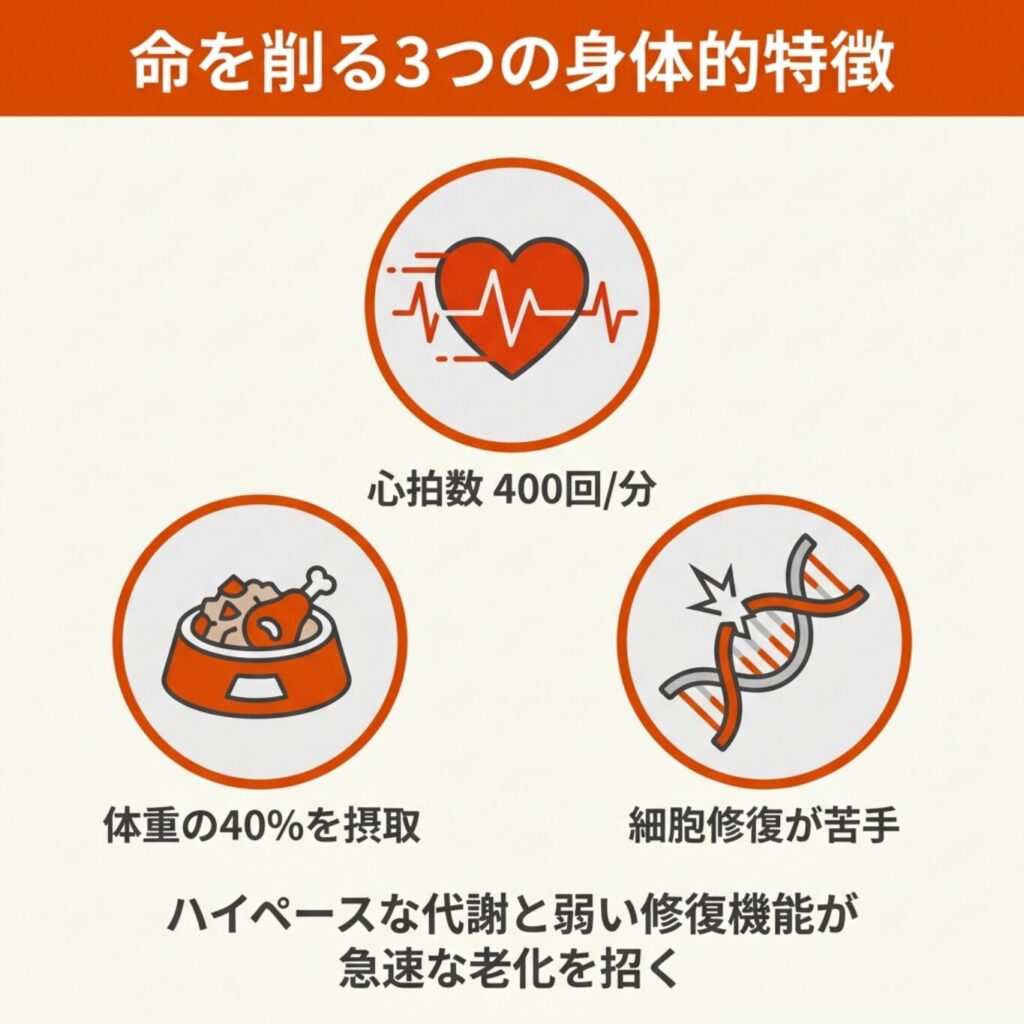心拍数の速さは活発な性格と高い運動能力を支える一方で、寿命を縮める原因になっています。