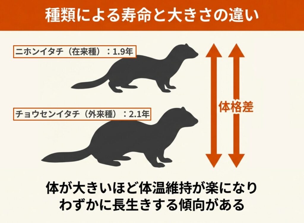 チョウセンイタチがニホンイタチより長生きする傾向にあるのは、体格の違いが関係しています。