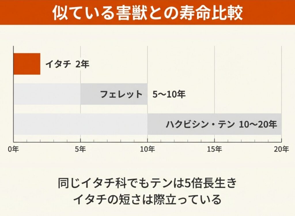 イタチの寿命は野生下で平均1.9年から2.1年、飼育下で1.4年と極めて短く、最長でも8年程度という短命な動物です。