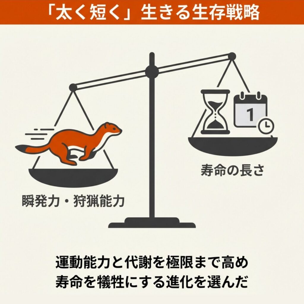 イタチの寿命が他の小型哺乳類と比べても際立って短いのには、明確な生物学的理由があります。