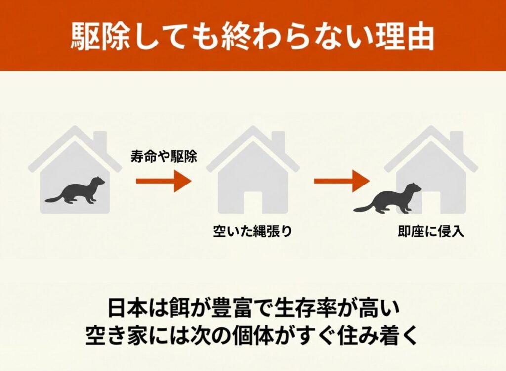 たとえば屋根裏に住み着いたイタチが寿命で死んでも、その縄張りには別の個体がすぐに侵入してきます。