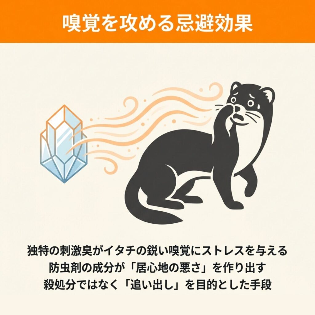 ナフタリンが発する独特のニオイは、人間にとっては「衣替えの匂い」程度ですが、イタチにとっては大きなストレス源となります。