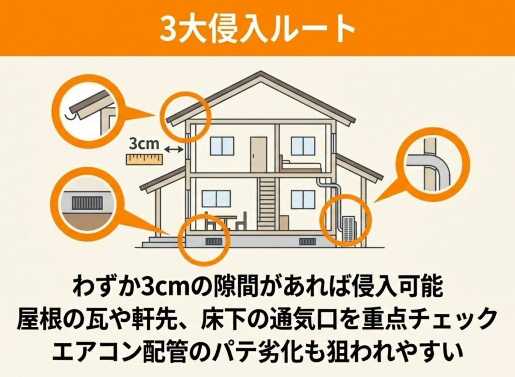イタチは3cm程度の隙間から侵入できるため、素人の目では見落としやすい箇所も多くあります。