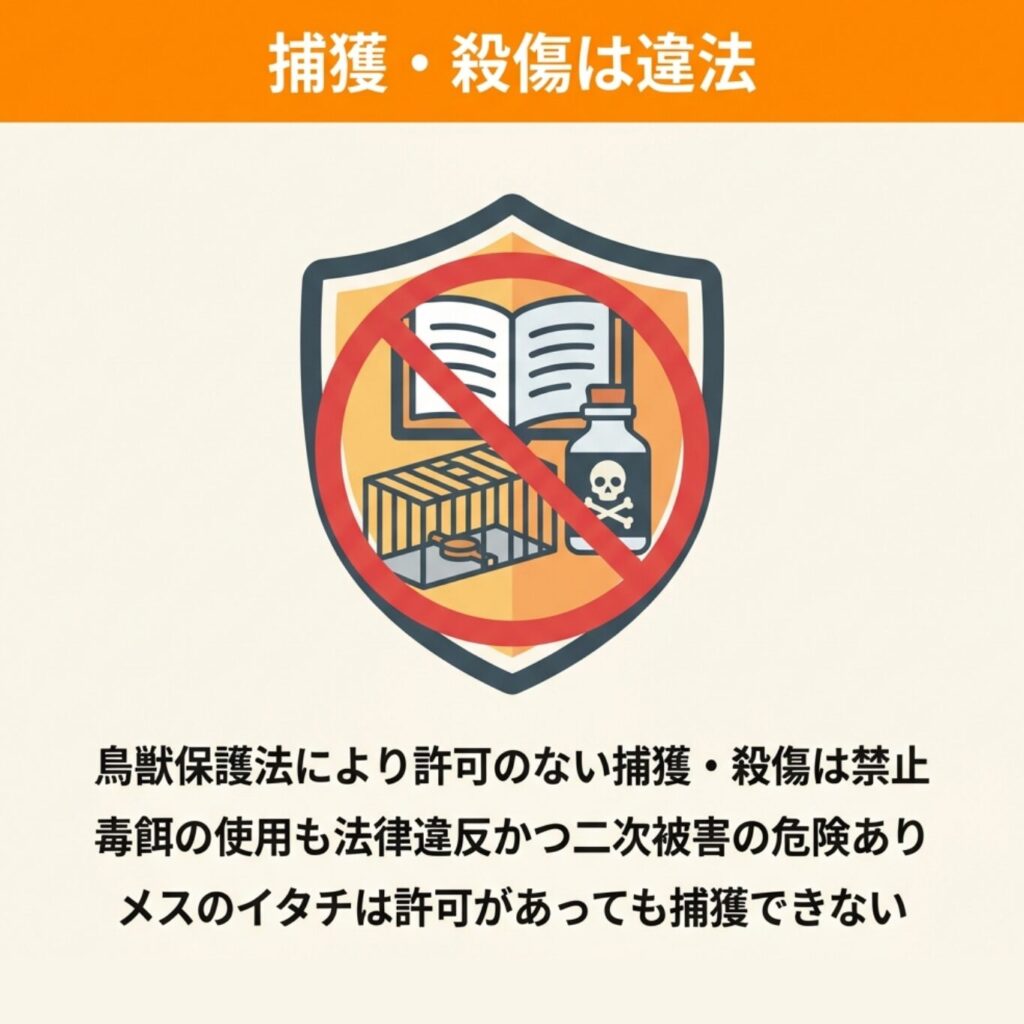 「困っているから捕まえよう」「毒餌で退治しよう」と安易に考えると、法律違反になるおそれがあります。