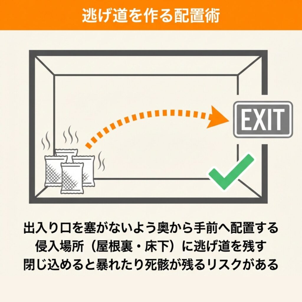 「追い出す」イメージで、出口に向かって逃げ道を作るような配置を心がけましょう。