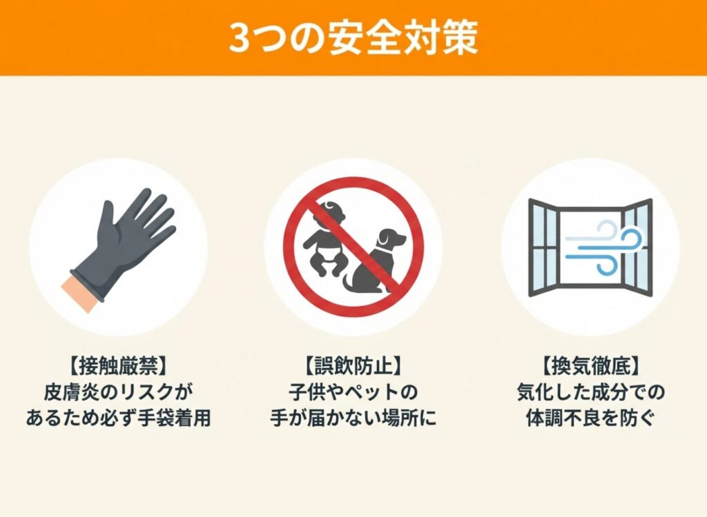 素手で触らない、子どもやペットの手が届かない場所に置く、換気を怠らないといった基本を守りましょう。