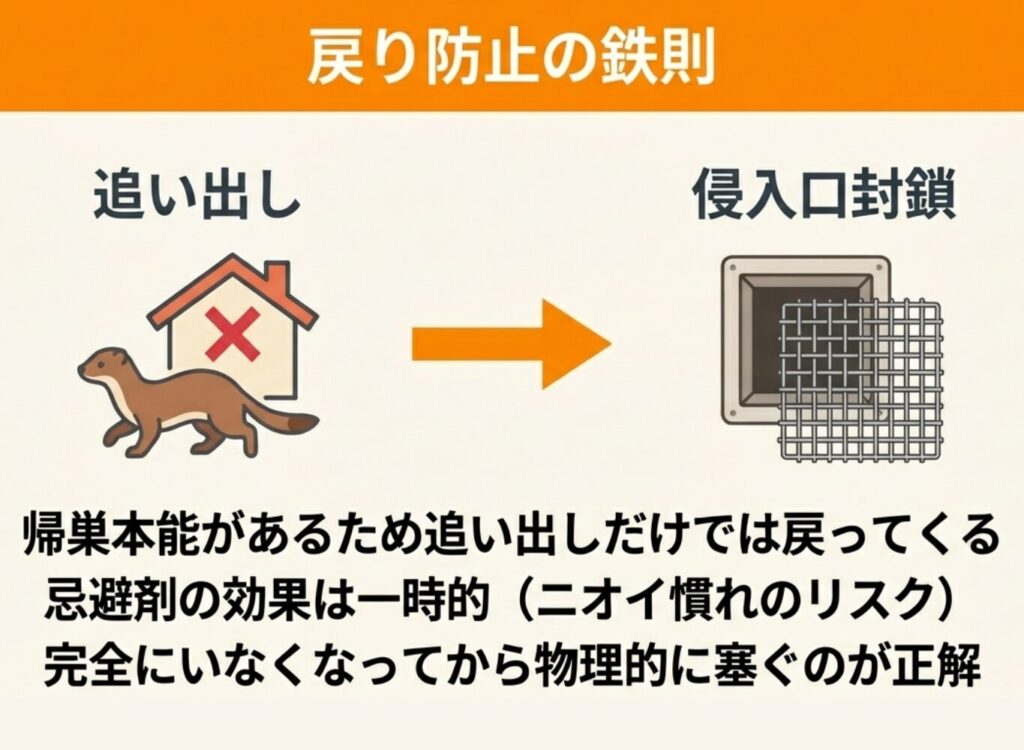 また、追い出した後は侵入口を塞がなければ、イタチは再び戻ってきてしまいます。