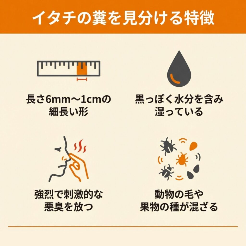 イタチの糞にはいくつかの特徴があり、形状・色・質感・臭い・内容物などを総合的に確認すれば、他の害獣との区別がつきやすくなります。