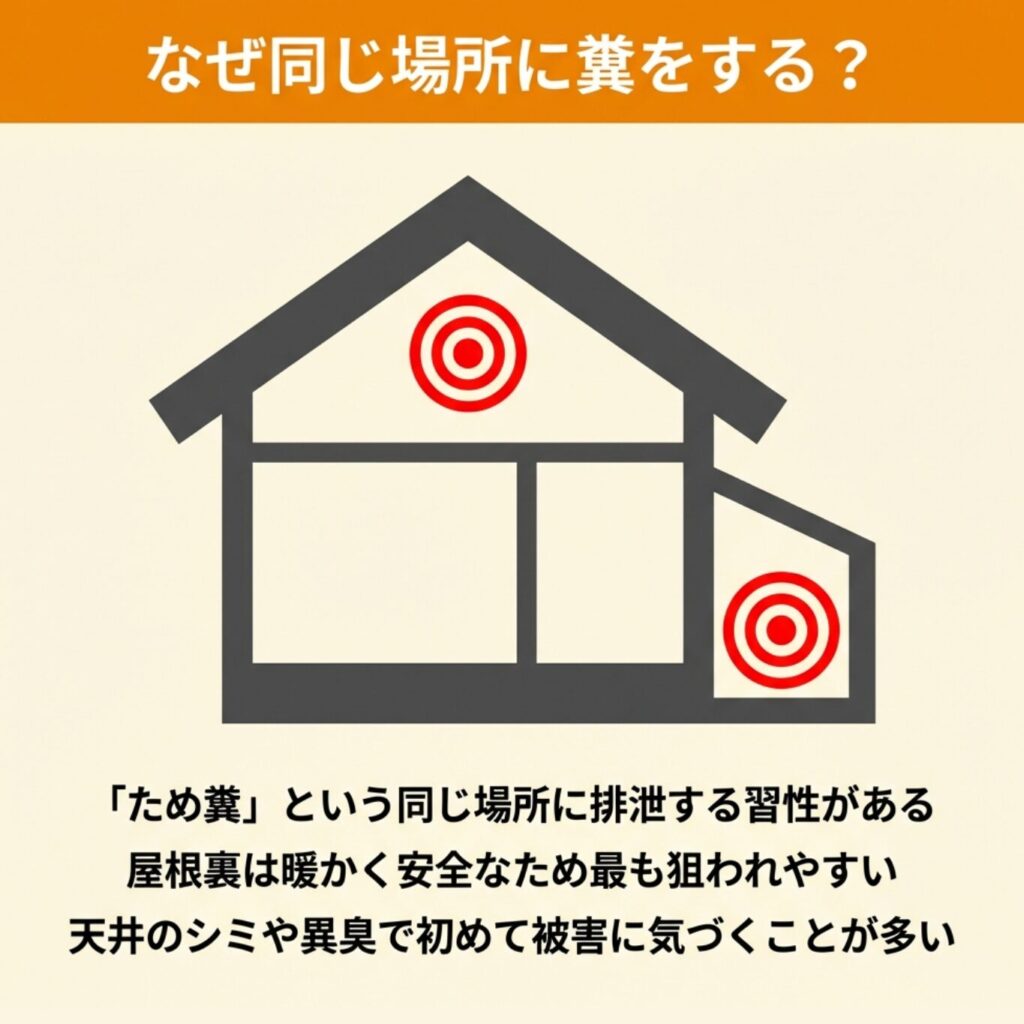 ため糞の習性により、放置すると糞尿が蓄積し、悪臭や建材の劣化が加速します。