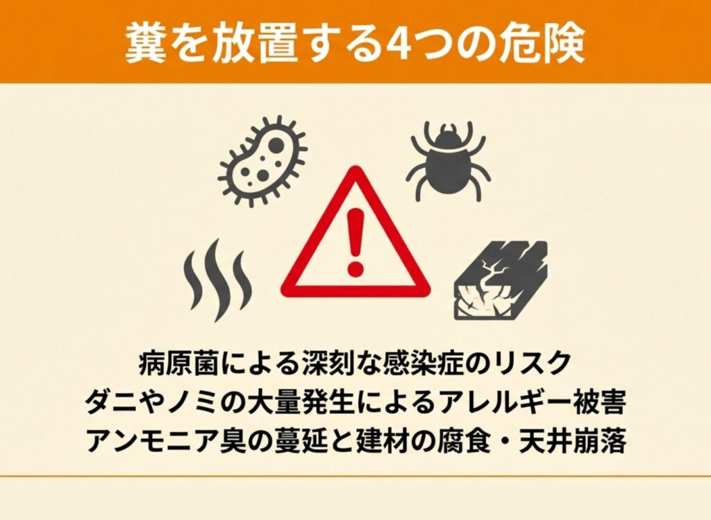 糞を放置すると、病原菌による感染症リスク、ダニやノミの発生、悪臭の拡散、建材の腐食など、さまざまな被害につながるおそれがあるため、早めの対処が欠かせません。