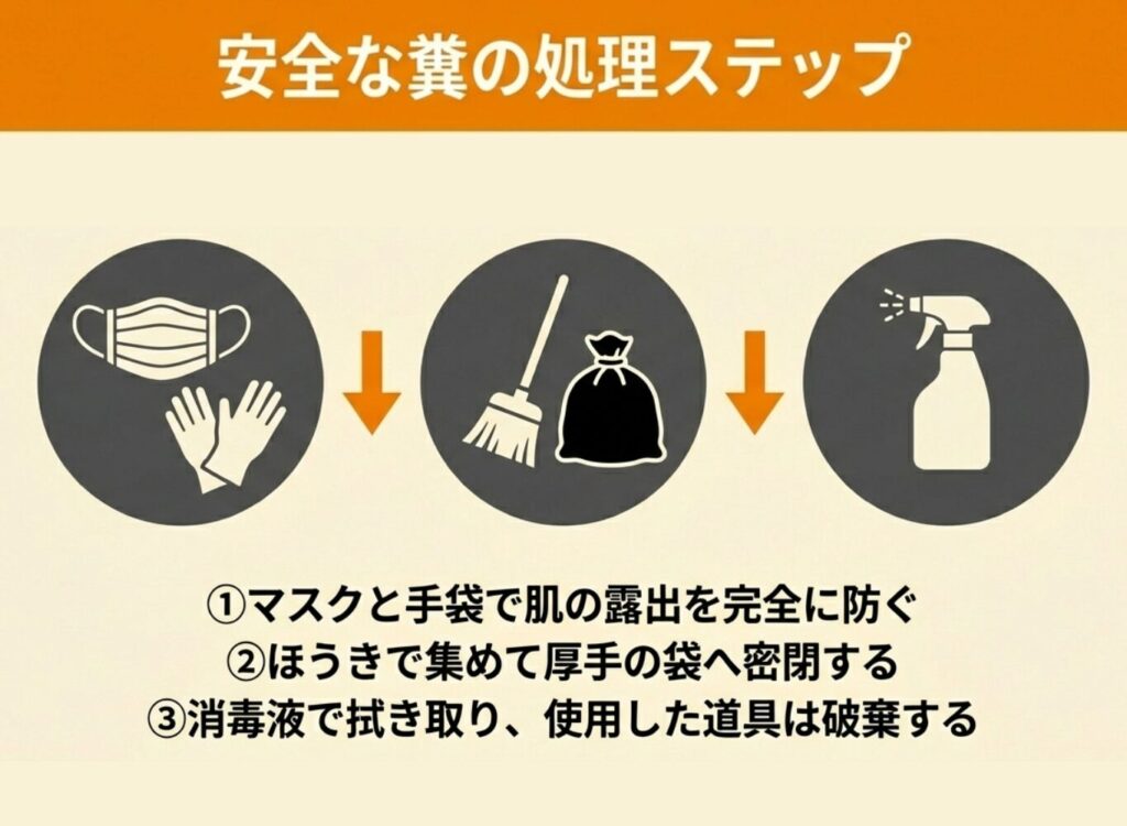 処理の際は防護具を必ず着用し、回収から消毒までの手順を守って安全に作業を行ってください。