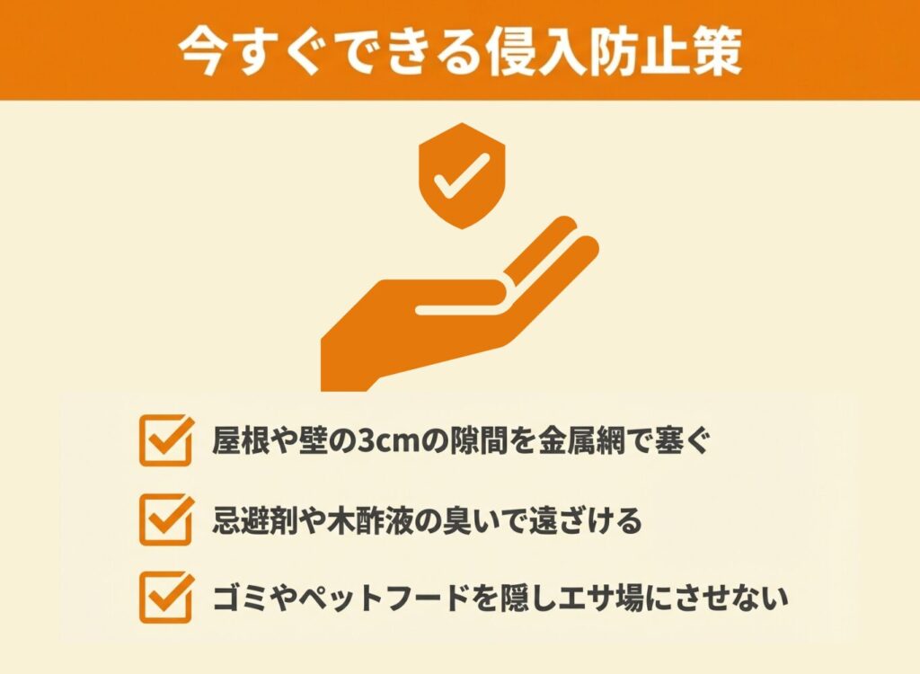 - 忌避剤や木酢液を侵入口付近に設置
