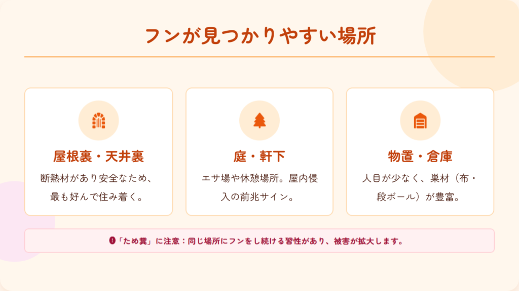 イタチは生活習性によって特定の場所でフンをする傾向があり、被害発見の手がかりになります。