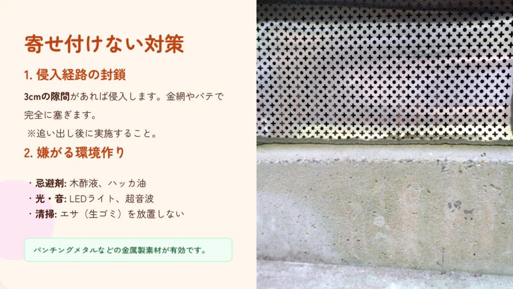 また、根本的な解決のためには侵入経路の封鎖や忌避対策など、総合的なアプローチが必要です。