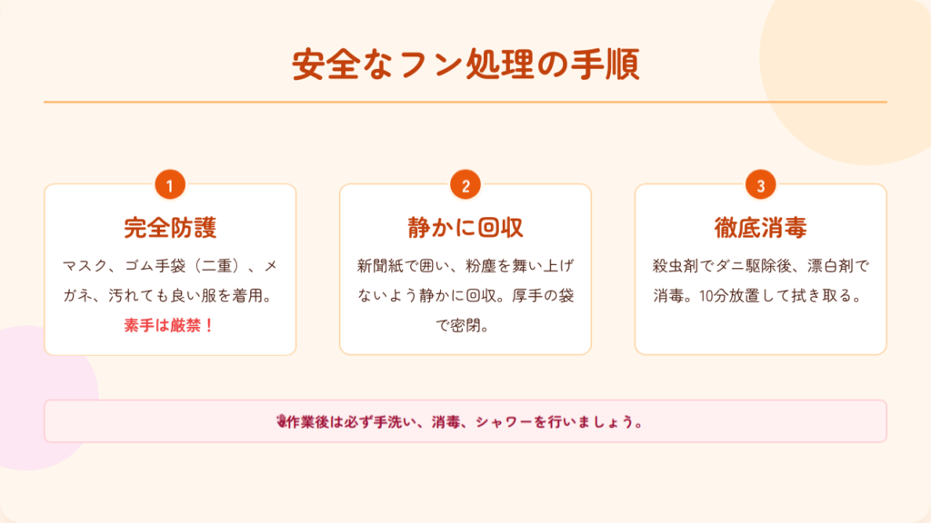 フンを処理する際は、きちんとした防護と正しい手順での作業が欠かせません。