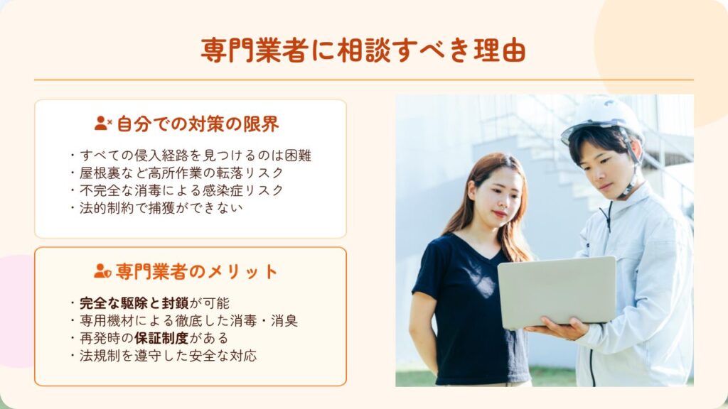 個人での対策には限界があり、特に法的な制約や安全面でのリスクを考えると、専門業者への相談が最も確実な解決方法です。