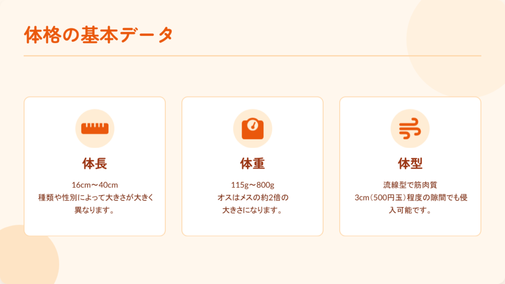 イタチの体格については、害獣対策を考えるときによく質問が寄せられます。