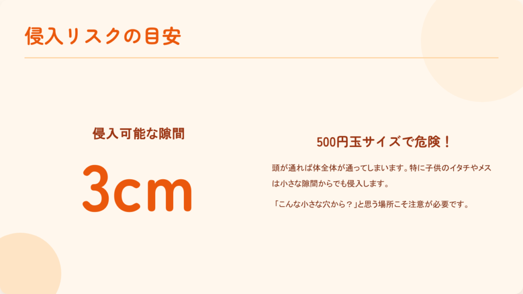 500円玉程度の隙間があれば侵入できるため、小さな開口部も見逃さないことが大切です。