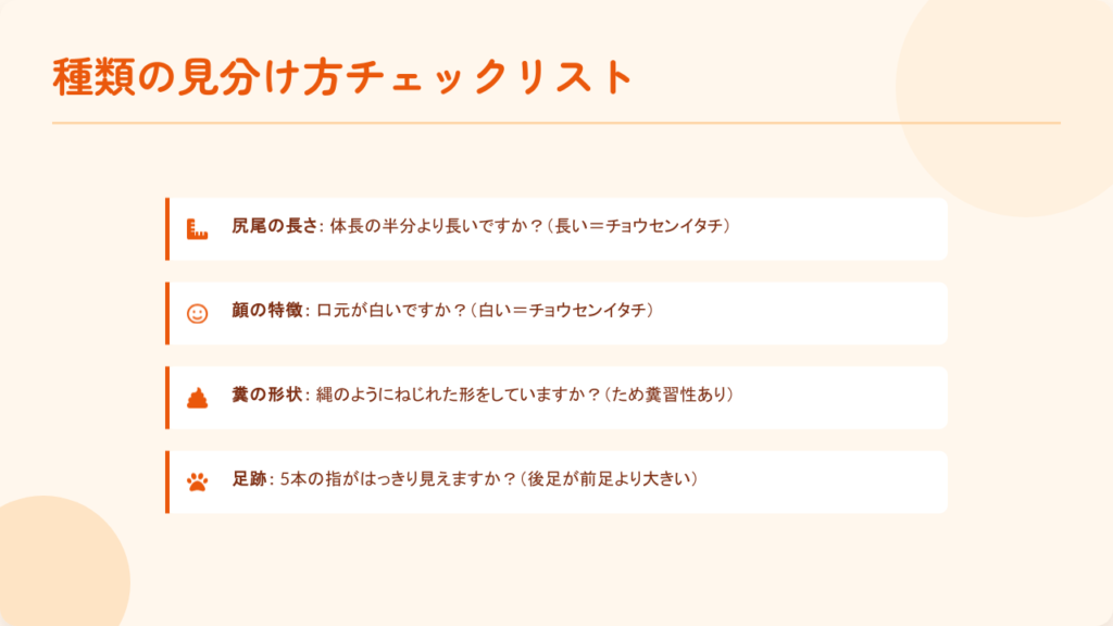 体格だけでなく、行動の痕跡や生態的な特徴も総合的に判断することで、確実に種類を識別できます。