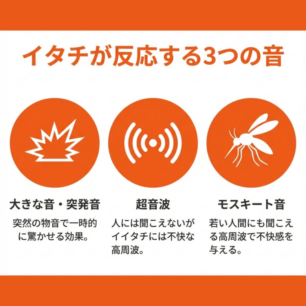 • 超音波(20,000Hz以上):人間には聞こえないが、イタチには不快な音