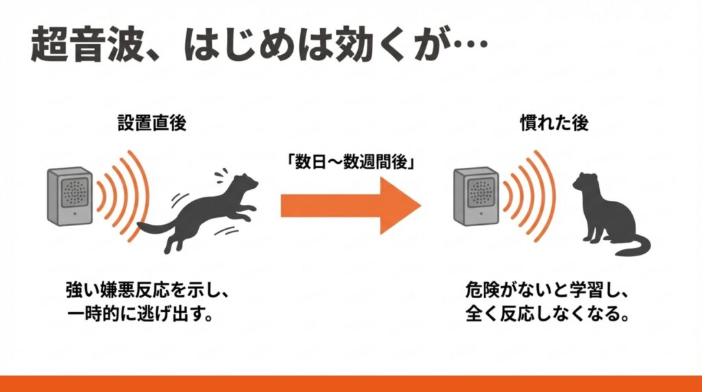 超音波装置を設置しても、多くの場合、数日から数週間でイタチが慣れてしまいます。