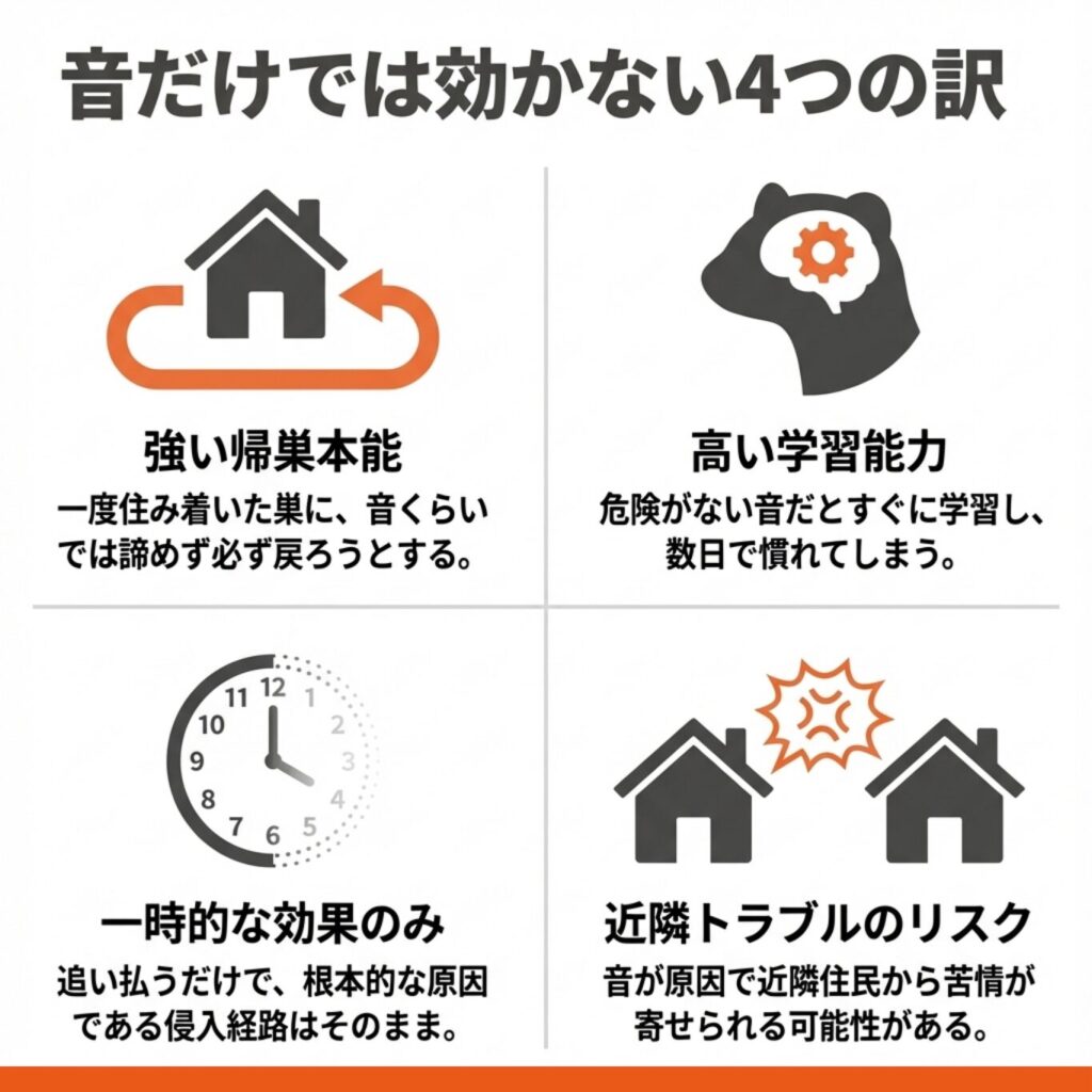 そのため、音による対策は一時的な追い出しには使えても、長期的な駆除には向いていません。