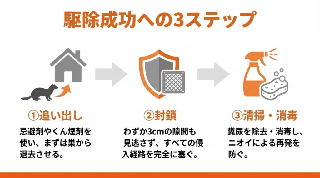 確実にイタチを駆除するには、「追い出し」「封鎖」「清掃」の3ステップが必要です。
